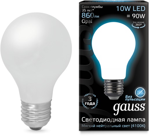Gauss 102202210 Лампа LED Filament A60 Opal E27 10W 4100К 1/10/40