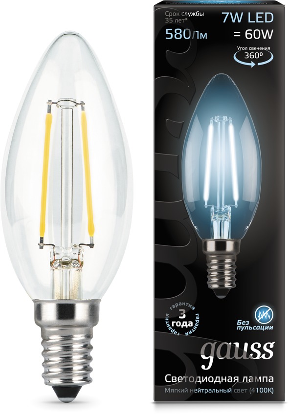 LED Filament Candle E14 7W 4100К (свеча) светодиодная лампа Gauss 103801207